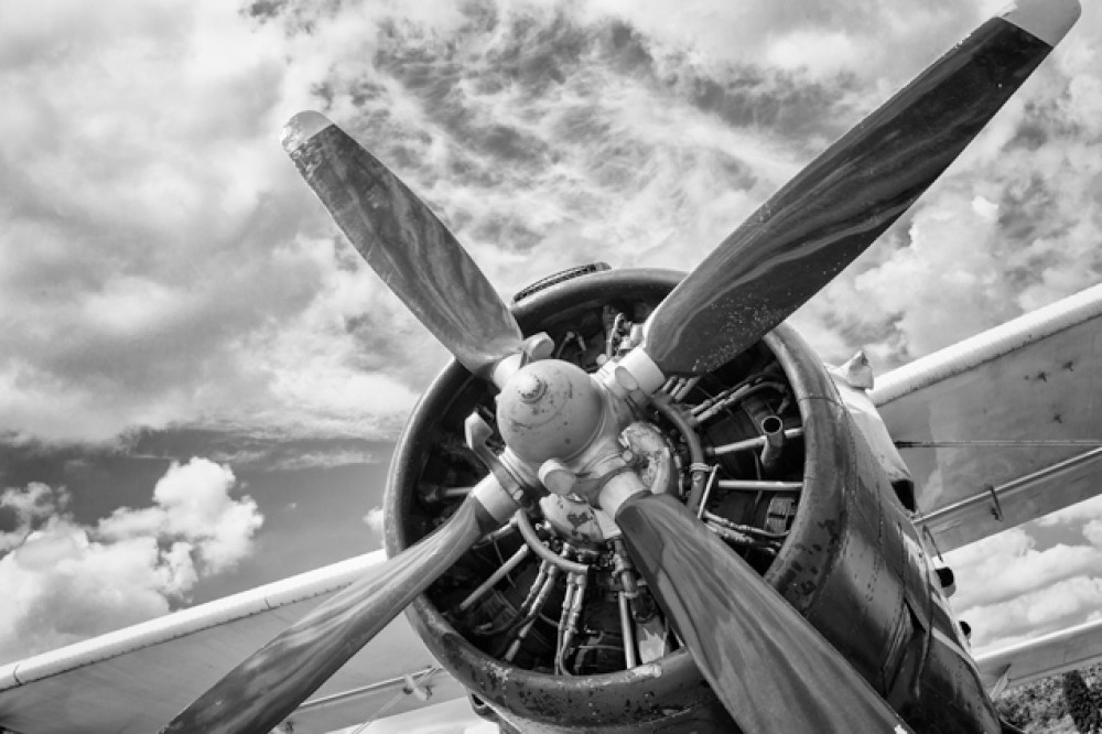 Dodaj do swojego wnętrza odrobinę lotniczej historii i stylu retro z fototapetą Detaliczny widok zabytkowego samolotu w czarno-białej tonacji. To dekoracja, która przyciąga spojrzenia i wprowadza wyjątkową atmosferę!