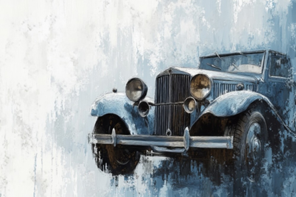 Wprowadź do swojego wnętrza elegancję, klasykę i pasję motoryzacyjną z fototapetą Klasyczny samochód w odcieniach szarości i błękitu. Stwórz przestrzeń pełną stylu, dynamiki i niezapomnianych wrażeń!