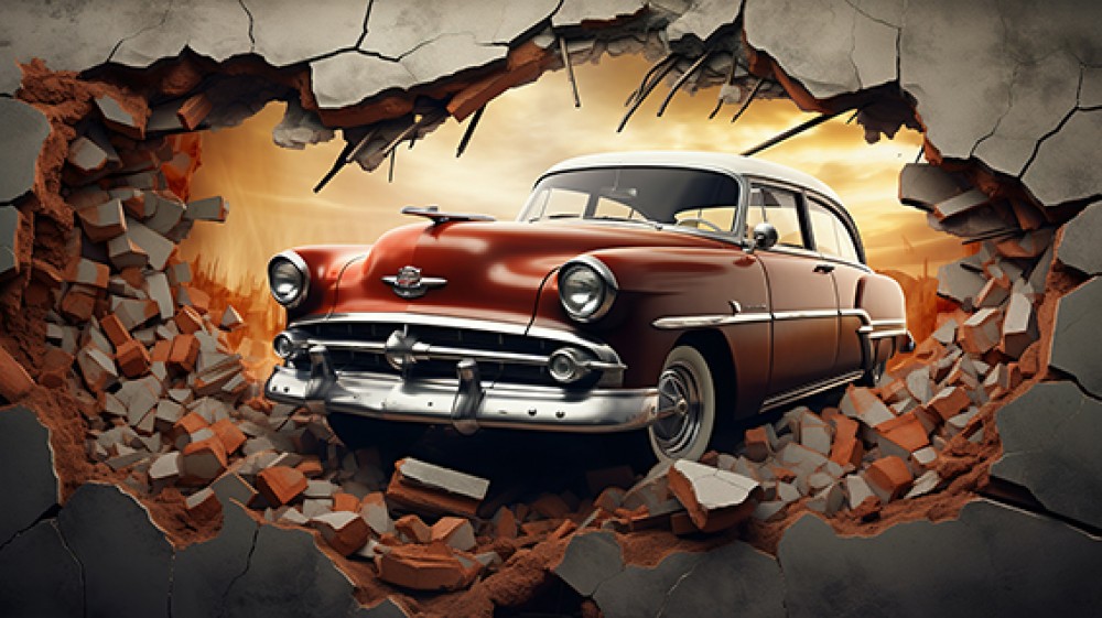 Nadaj swojemu wnętrzu niepowtarzalny, dynamiczny charakter dzięki fototapecie Stary samochód wyskakujący z rozbitej ściany z graffiti. Ten niezwykły wzór łączy efekt trójwymiarowej iluzji z miejskim klimatem street artu, tworząc spektakularną dekorację, która przyciąga wzrok i dodaje wnętrzu energii.