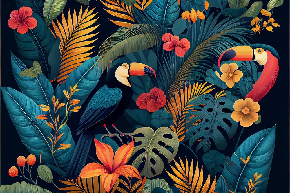 Fototapeta Tukany, tropikalne liście i kwiaty #wf406