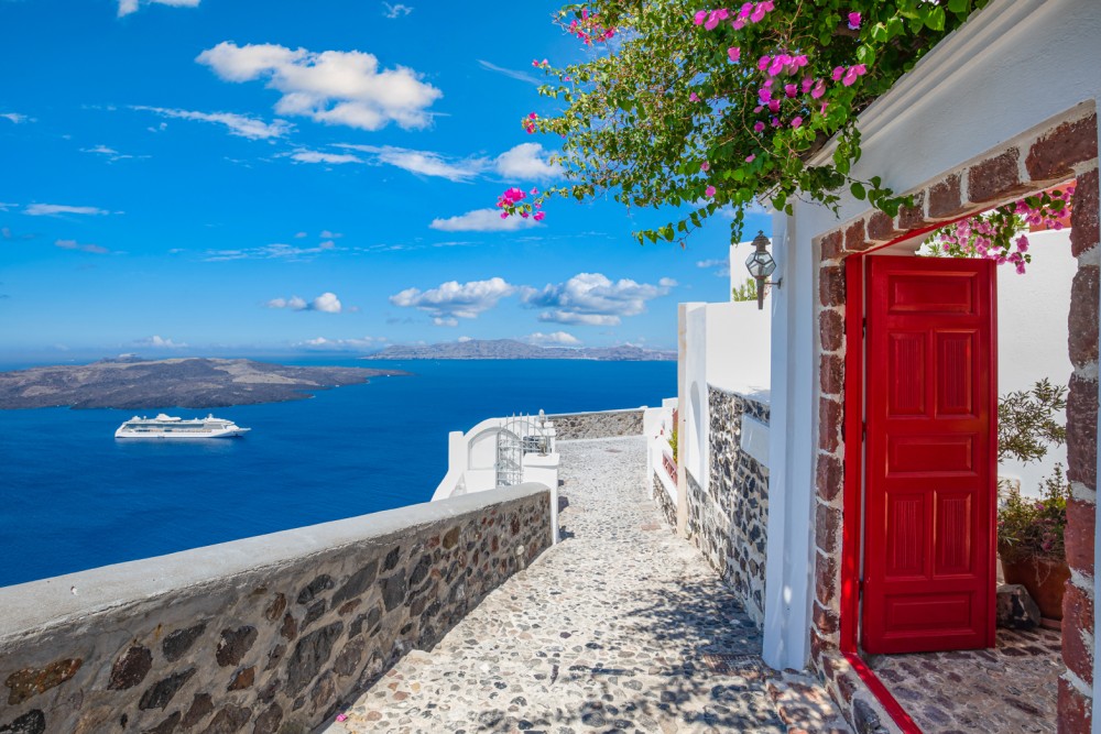 Wybierz fototapetę Uliczka z czerwoną bramą w Santorini i wprowadź do swojego domu magię Grecji!