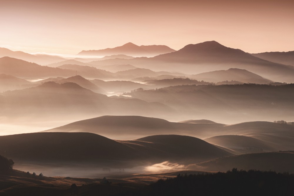 Zanurz się w magiczny świat porannych pejzaży dzięki fototapecie Złote wzgórza w porannej mgle. Ten wyjątkowy motyw przedstawia delikatnie oświetlone wzgórza i góry spowite złotą mgłą, tworząc atmosferę spokoju i naturalnego piękna. To idealne rozwiązanie dla osób ceniących sobie unikalny design inspirowany naturą.