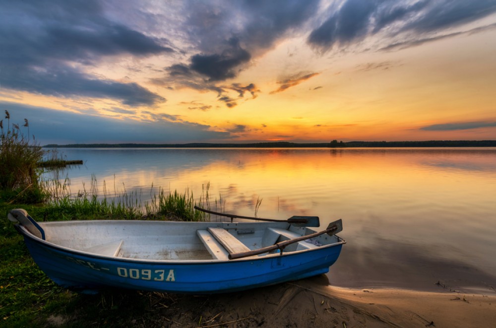Zachwycający krajobraz mazurskiego jeziora o zachodzie słońca może stać się częścią Twojego domu. Fototapeta Złoty zachód – łódź na tle mazurskiego nieba to połączenie spokoju natury i niezwykłej estetyki, które stworzy w Twoim wnętrzu atmosferę relaksu i harmonii.